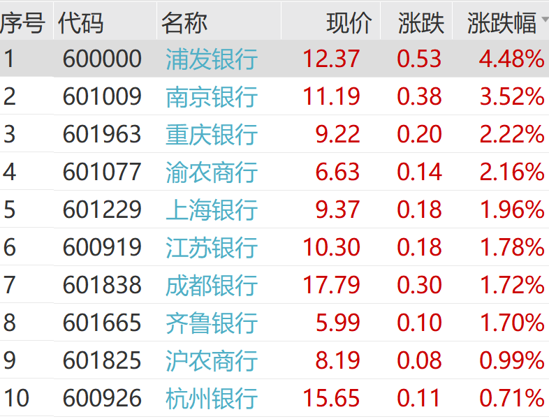 10月13日上午,银行板块涨幅居于申万一级行业首位。个股方面,浦发银行涨超4%,南京银行涨超3%,重庆银行、渝农商行、上海银行等涨幅居前。