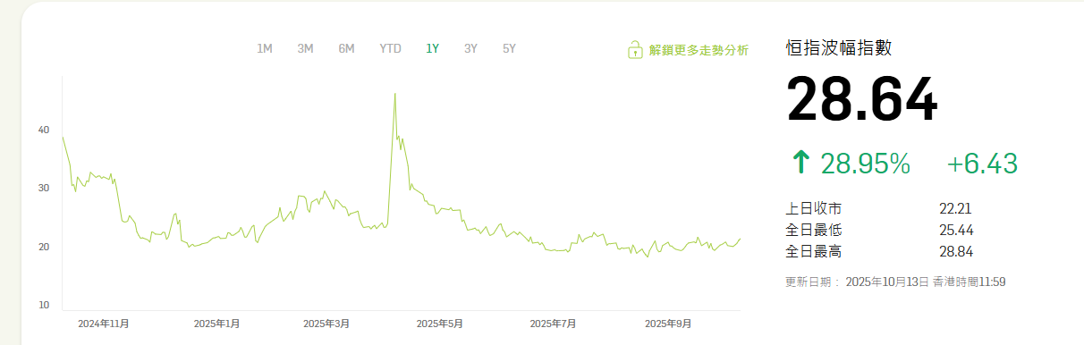 10月13日早盘,港股低开低走,截至早盘收市,恒生指数跌幅扩大至3.49%,报25373.43点。港股版“恐慌指数”恒指波幅指数飙升近29%,创2025年5月以来新高。