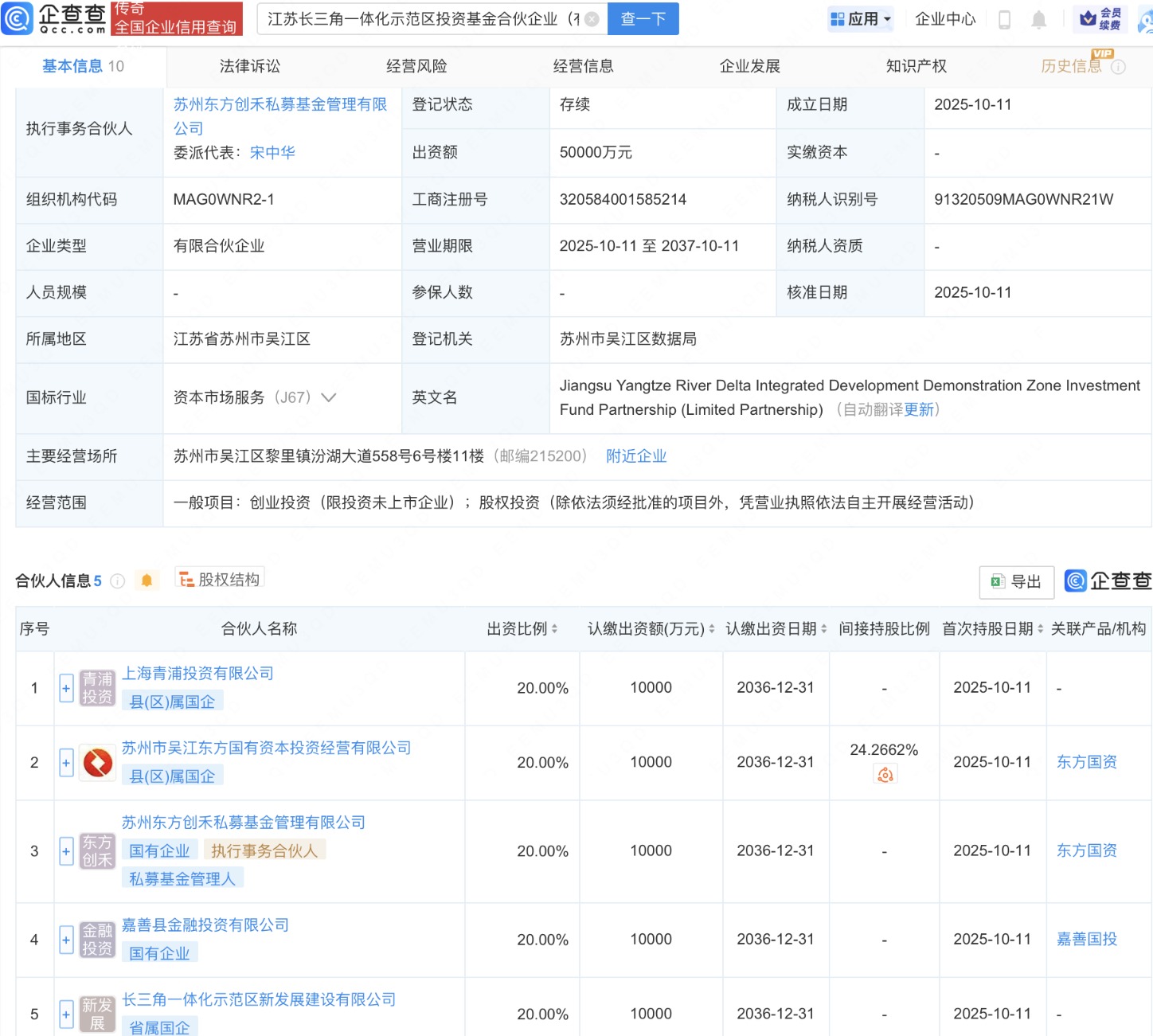 据企查查股权穿透显示,其中上海青浦投资有限公司出资占比20%、苏州市吴江东方国有资本投资经营有限公司出资占比20%、苏州东方创禾私募基金管理有限公司出资占比20%、嘉善金融投资有限公司出资占比为20%、长三角一体化示范区发展建设有限公司出资占比20%。由苏州东方创禾私募基金出任执行事务合伙人。