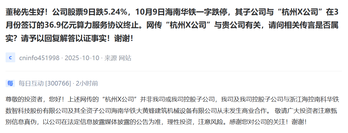 每日互动:公司及控股子公司均未与海南华铁及其子公司发生过商业合作