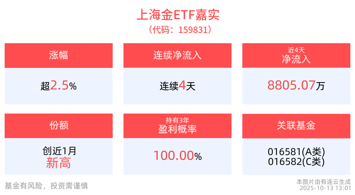 10月13日,现货黄金继续冲高,一度突破4060美元/盎司,刷新历史新高。场内ETF方面,截至2025年10月13日 13:01,上海金ETF嘉实(159831)上涨2.53%。拉长时间看,截至2025年10月10日,上海金ETF嘉实近2周累计上涨5.34%。