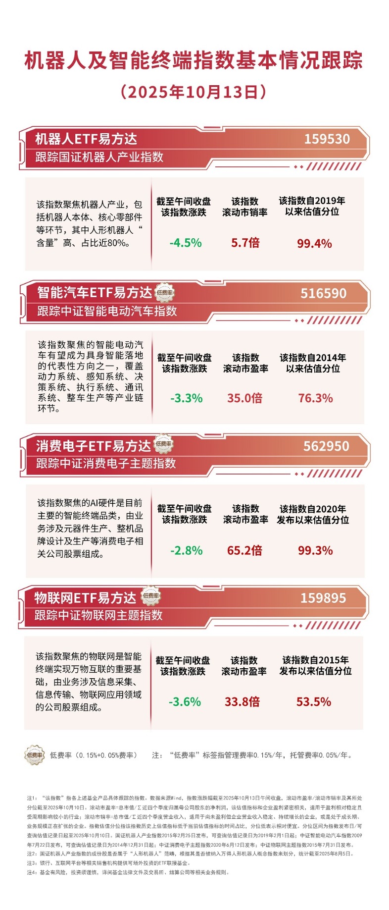 机器人、智能驾驶、消费电子等板块早盘集体回调,截至午间收盘,国证机器人产业指数下跌4.5%,中证智能电动汽车指数下跌3.3%,中证消费电子主题指数下跌2.8%,中证物联网主题指数下跌3.6%,机器人ETF易方达(159530)早盘获5500万份净申购。