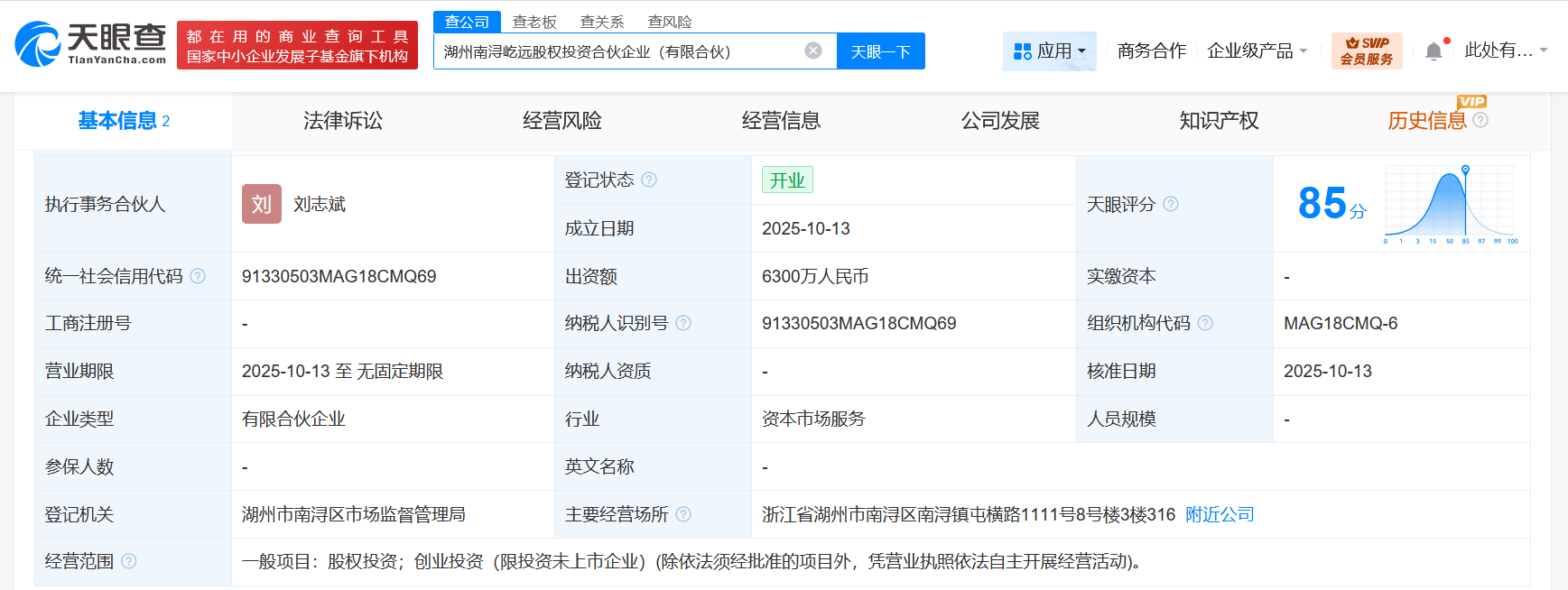 每经AI快讯,天眼查App显示,近日,湖州南浔屹远股权投资合伙企业(有限合伙)成立,执行事务合伙人为刘志斌,出资额6300万元人民币,经营范围为股权投资、创业投资。合伙人信息显示,该合伙企业由上海恒旭创领私募基金管理有限公司、湖州南浔产业振兴母基金股权投资合伙企业(有限合伙)共同出资。