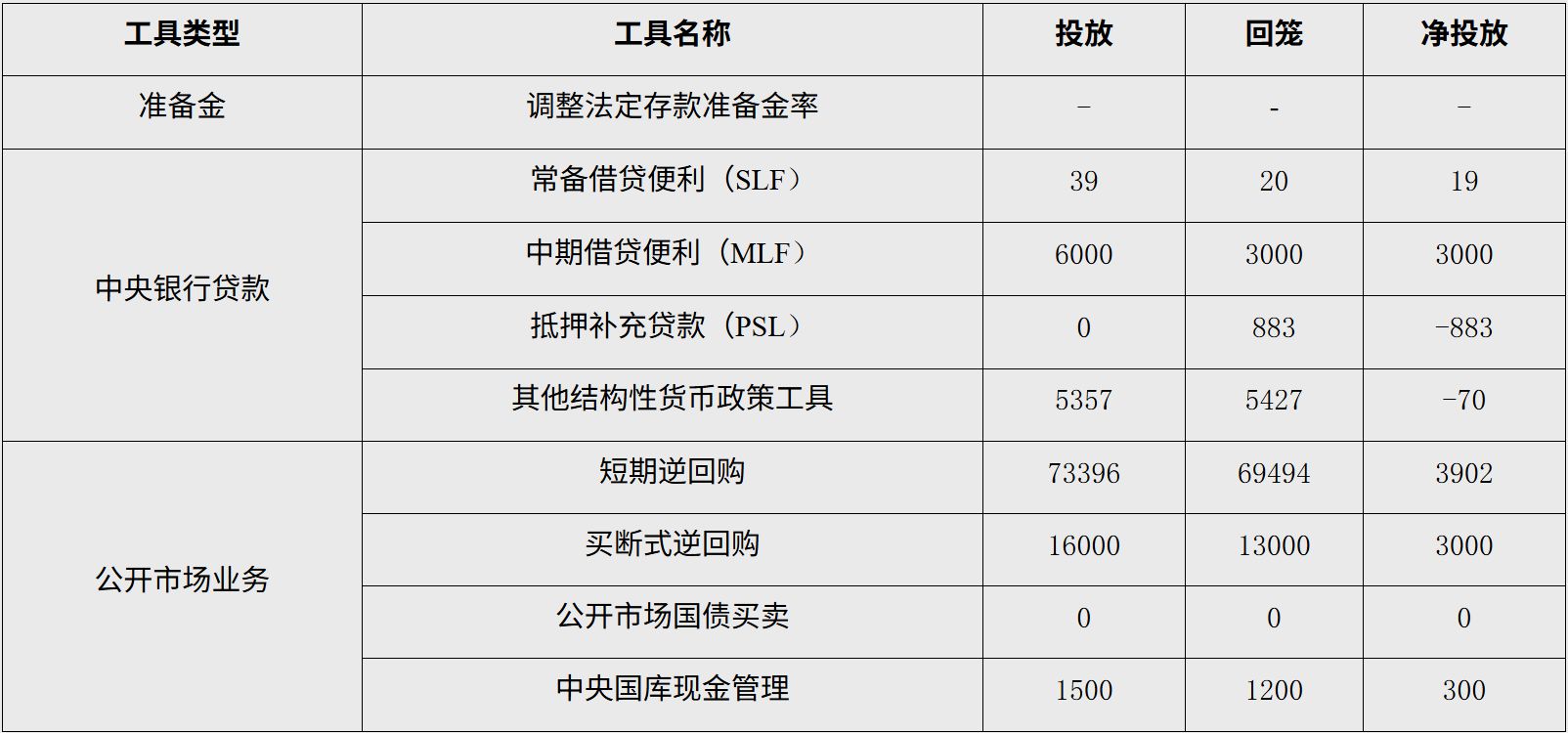 上周披露的中央银行各项工具流动性投放情况显示,9月,常备借贷便利(SLF)净投放19亿元,中期借贷便利(MLF)净投放3000亿元,抵押补充贷款(PSL)净回笼883亿元,短期逆回购净投放3902亿元,买断式逆回购净投放3000亿元,没有开展公开市场国债买卖。