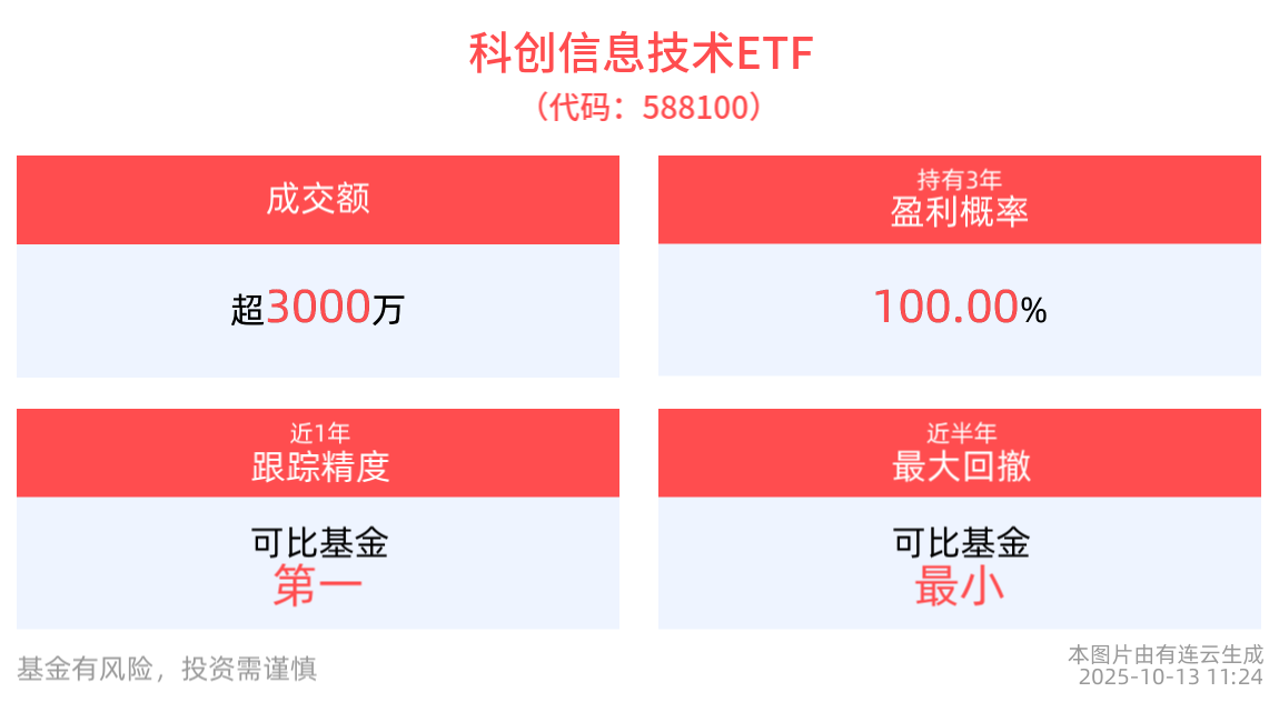 截至10月10日,科创信息技术ETF近3年净值上涨143.41%,指数股票型基金排名29/1883,居于前1.54%。从收益能力看,截至2025年10月10日,科创信息技术ETF自成立以来,最高单月回报为32.25%,最长连涨月数为4个月,最长连涨涨幅为63.37%,上涨月份平均收益率为9.73%。