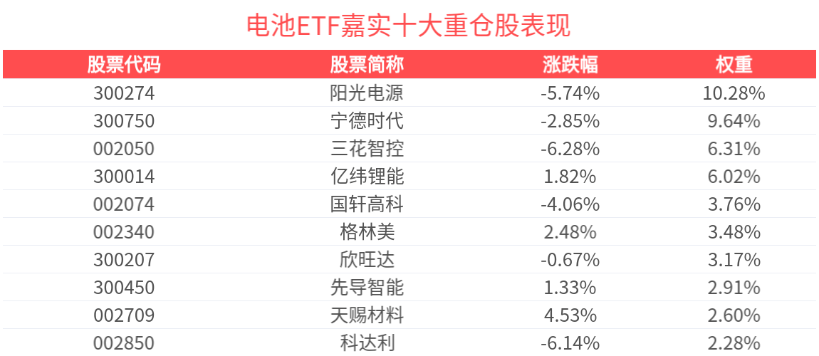 数据显示,截至2025年9月30日,中证电池主题指数前十大权重股分别为阳光电源、宁德时代、亿纬锂能、三花智控、先导智能、天赐材料、国轩高科、欣旺达、格林美、科达利,前十大权重股合计占比55.79%。