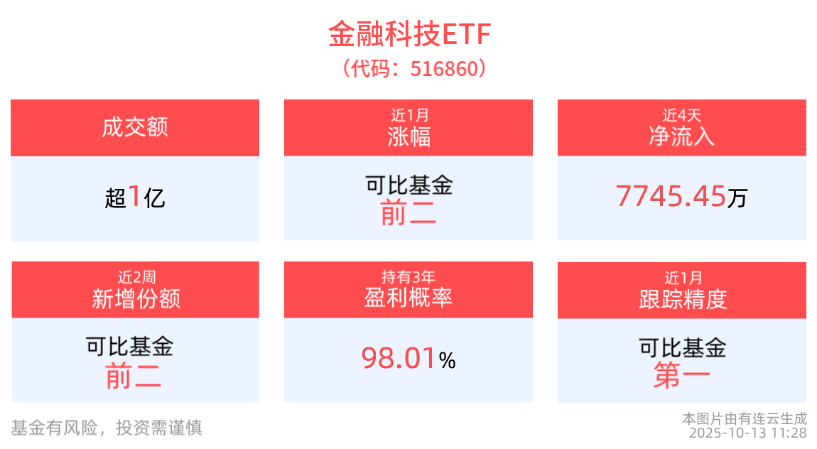 流动性方面,金融科技ETF盘中换手4.28%,成交1.07亿元。拉长时间看,截至10月10日,金融科技ETF近1月日均成交2.86亿元,居可比基金前2。
