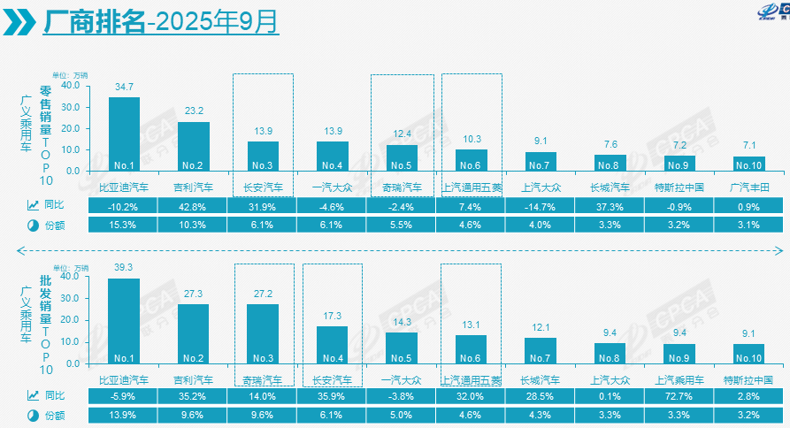 不仅如此,在9月的厂商批发销量排名中,比亚迪、吉利汽车、奇瑞汽车、长安汽车更是包揽了前四名。