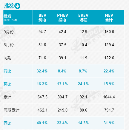 9月,新能源乘用车批发销量达到150万辆,同比增长22.4%,环比增长15.9%,厂商批发渗透率为53.5%,较2024年9月提升4.4个百分点。