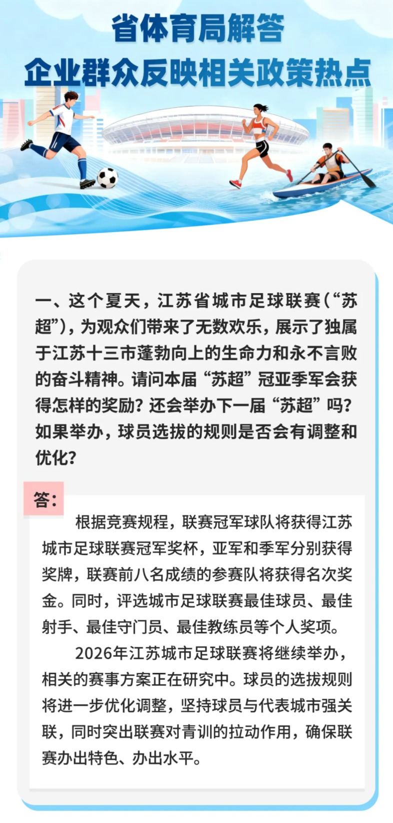 据“微讯江苏”微信公众号10月13日消息,江苏省体育局解答企业群众反映相关政策热点时表示,2026年江苏城市足球联赛将继续举办,相关的赛事方案正在研究中。球员的选拔规则将进一步优化调整,坚持球员与代表城市强关联,同时突出联赛对青训的拉动作用,确保联赛办出特色、办出水平。