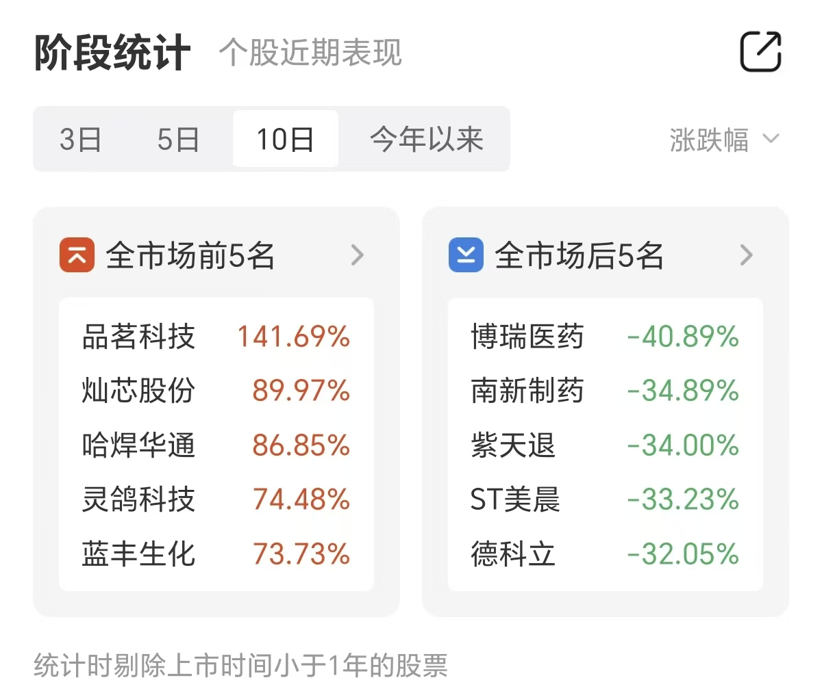 与此同时,近十个交易日涨幅前五名的个股分别为品茗科技、灿芯股份、哈焊华通、灵鸽科技、蓝丰生化。