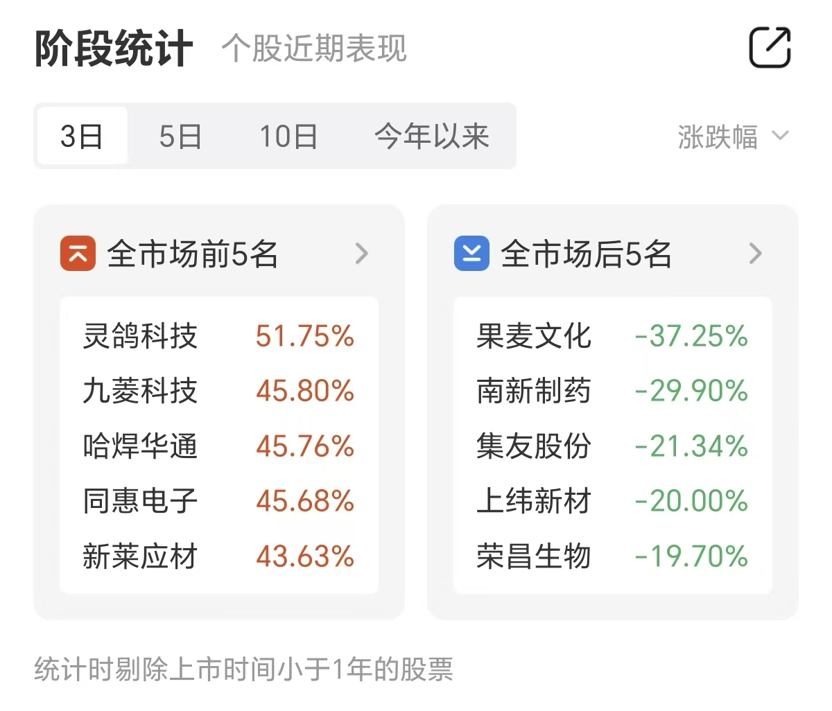 周一市场全天震荡回升,A股全市场涨幅前五名分别为灵鸽科技、九菱科技、哈焊华通、同惠电子、新莱应材,其中灵鸽科技三日涨幅达51.75%,位列涨幅榜第一。
