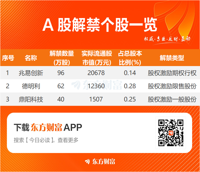 【明日解禁】明日3股解禁 兆易创新、德明利解禁市值居前