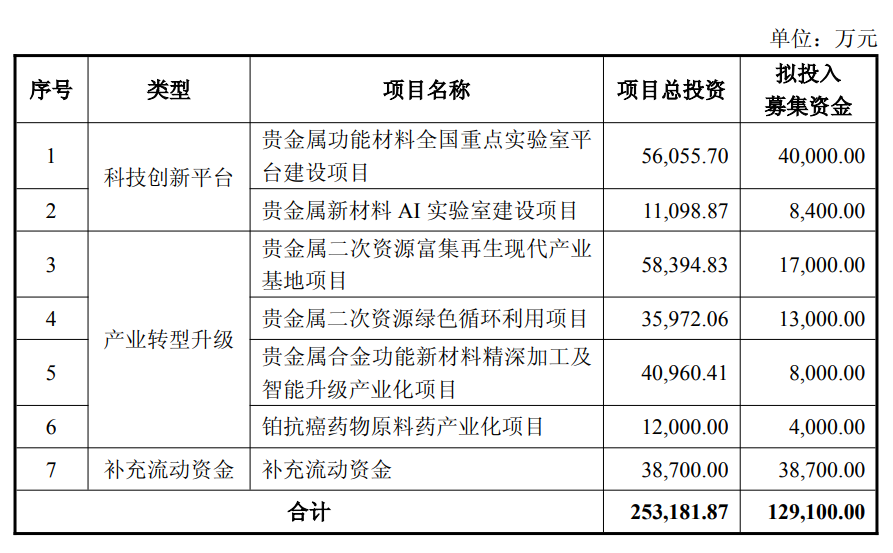 从募集资金用途来看,本次12.91亿元募资将分三大方向投入:其中4.84亿元用于科技创新平台建设,包括投入4亿元建设贵金属功能材料全国重点实验室平台、8400万元建设贵金属新材料AI实验室,前者聚焦贵金属功能材料、前驱体催化材料关键技术突破,后者则通过AI技术优化催化材料研发效率;4.2亿元投向产业转型升级,具体包括1.7亿元用于贵金属二次资源富集再生现代产业基地、1.3亿元用于贵金属二次资源绿色循环利用、8000万元用于贵金属合金功能新材料精深加工及智能升级、4000万元用于铂抗癌药物原料药产业化;另有3.87亿元用于补充流动资金,以优化资本结构,缓解资金压力。