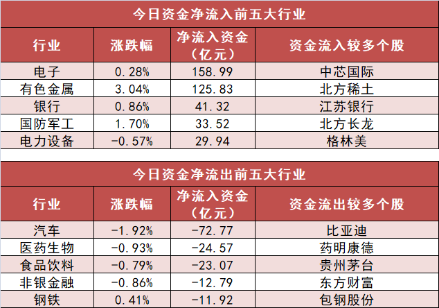 申万一级行业中,16个行业实现资金净流入,其中电子行业净流入158.99亿元居首。