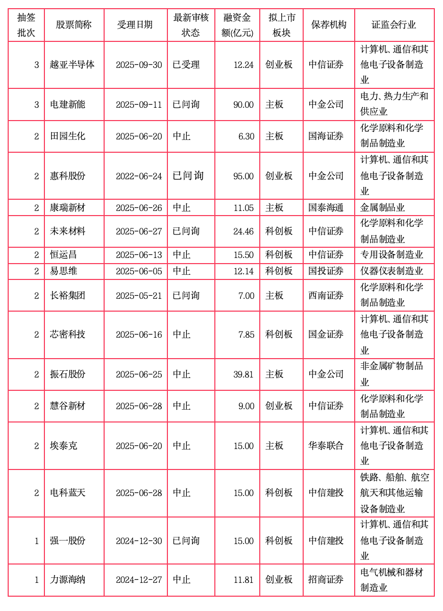 近日,中国证券业协会公布了2025年第三批首发企业现场检查抽签名单,中电建新能源集团股份有限公司(下称“电建新能”)与珠海越亚半导体股份有限公司(下称“越亚半导体”)被纳入检查范围。