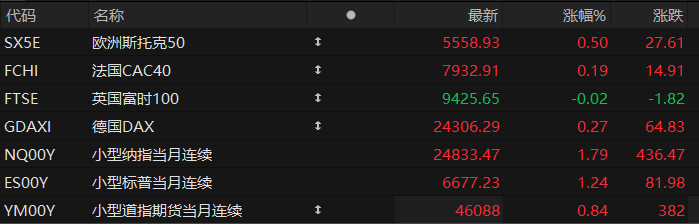 周一盘前,美股三大股指期货齐涨,欧洲主要指数多数上涨。截至发稿,纳斯达克100指数期货涨1.79%,标普500指数期货涨1.24%,道指期货涨0.84%。