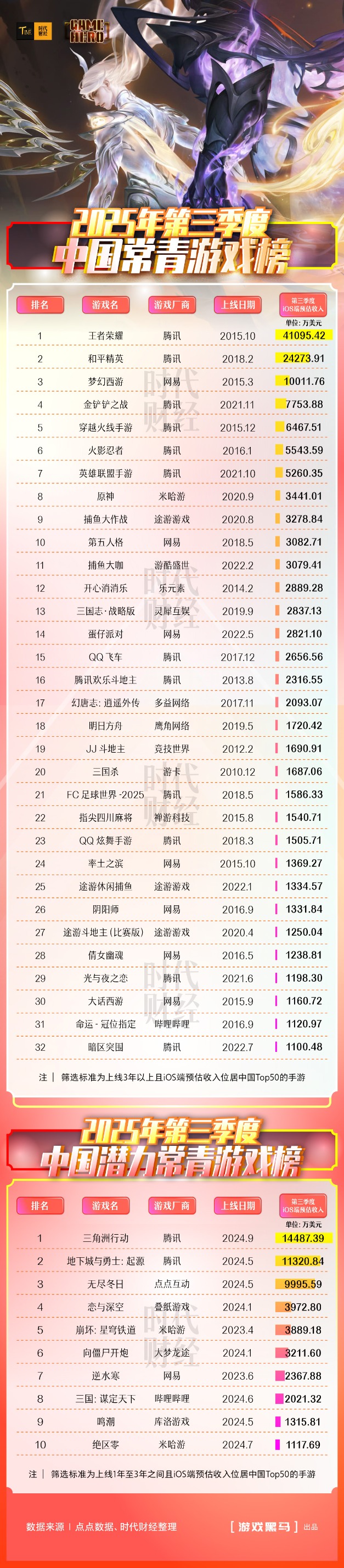 时代财经以上线3年以上且iOS端预估收入跻身中国地区Top50为筛选标准,统计并发布《2025年第三季度中国常青游戏榜》(下称《常青榜》);同时以上线1年至3年且iOS端预估收入跻身中国地区Top 50为标准,统计并发布《2025年第三季度中国潜力常青游戏榜》(下称《潜力常青榜》)。