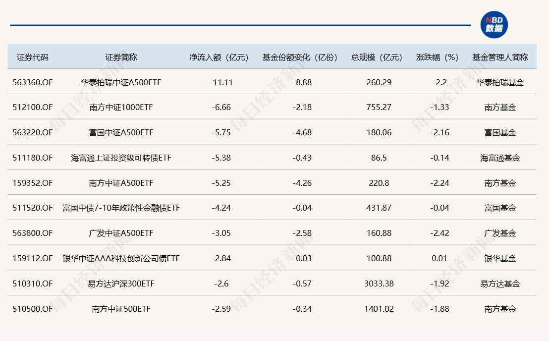 与此同时,华泰柏瑞中证A500ETF基金份额减少8.88亿份,净流出额为11.11亿元;南方中证1000ETF基金份额减少2.18亿份,净流出额为6.66亿元;富国中证A500ETF基金份额减少4.68亿份,净流出额为5.75亿元。