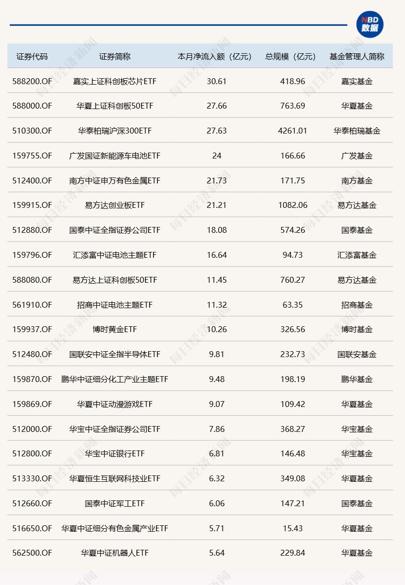 Wind数据显示,在10月10日非货币ETF市场中,华夏上证科创板50ETF基金份额增加21.29亿份,净流入额为32.95亿元;嘉实上证科创板芯片ETF基金份额增加10.95亿份,净流入额为27.48亿元;华泰柏瑞沪深300ETF基金份额增加3.34亿份,净流入额为15.87亿元。