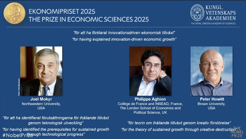 10月13日,2025年诺贝尔经济学奖得主揭晓。瑞典皇家科学院决定将2025年度瑞典中央银行纪念阿尔弗雷德·诺贝尔经济学奖授予乔尔·莫基尔(Joel Mokyr)、菲利普·阿吉翁(Philippe Aghion)和彼得·豪伊特(Peter Howitt),以表彰他们“对创新驱动型经济增长的阐释”。