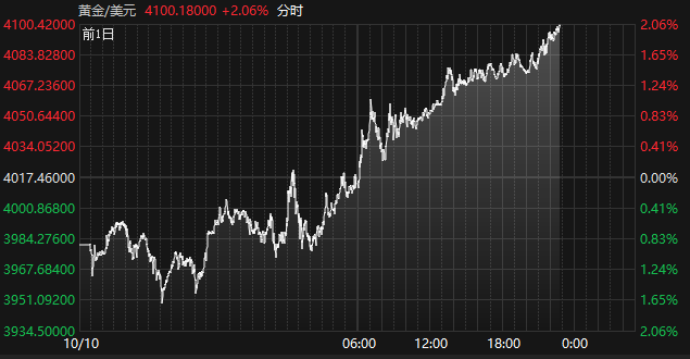 国际现货黄金站上4100美元关口 盘中大涨超2%