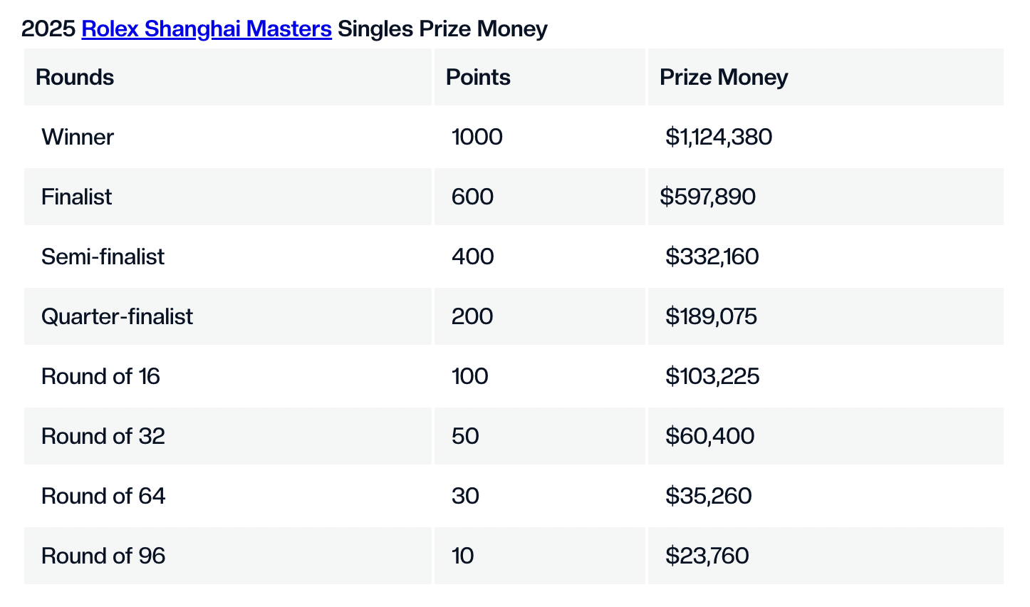 2025劳力士大师赛奖金。来源:ATP TOUR 官网