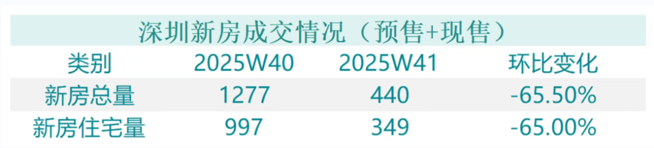 据深圳市房地产信息平台数据,2025年第41周全市新房(预售+现售)成交量受双节假期影响波动变化。
