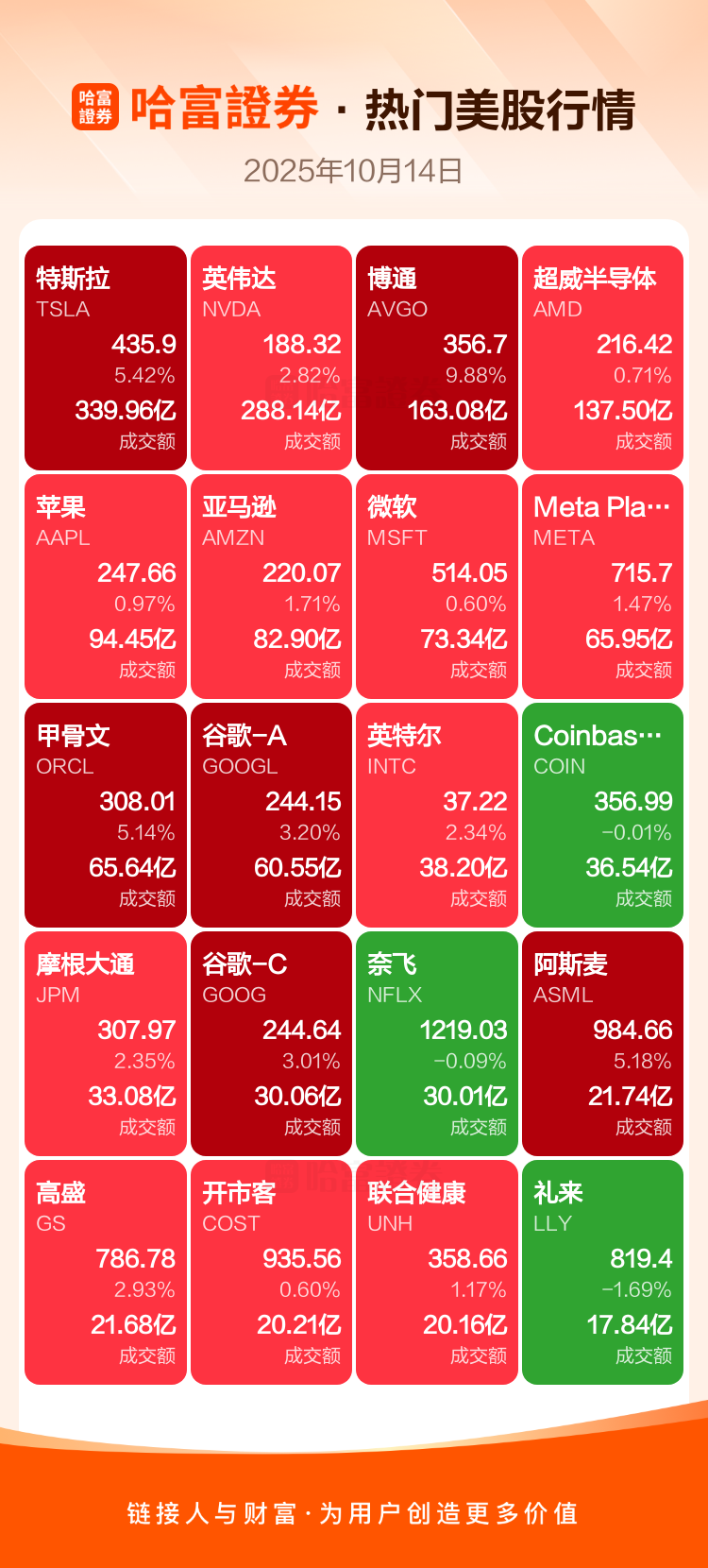 特斯拉涨5.42%,英伟达涨2.82%,博通涨9.88%,超威半导体涨0.71%,苹果涨0.97%,亚马逊涨1.71%,微软涨0.60%,Meta Platforms Inc-A涨1.47%,甲骨文涨5.14%,谷歌-A涨3.20%。