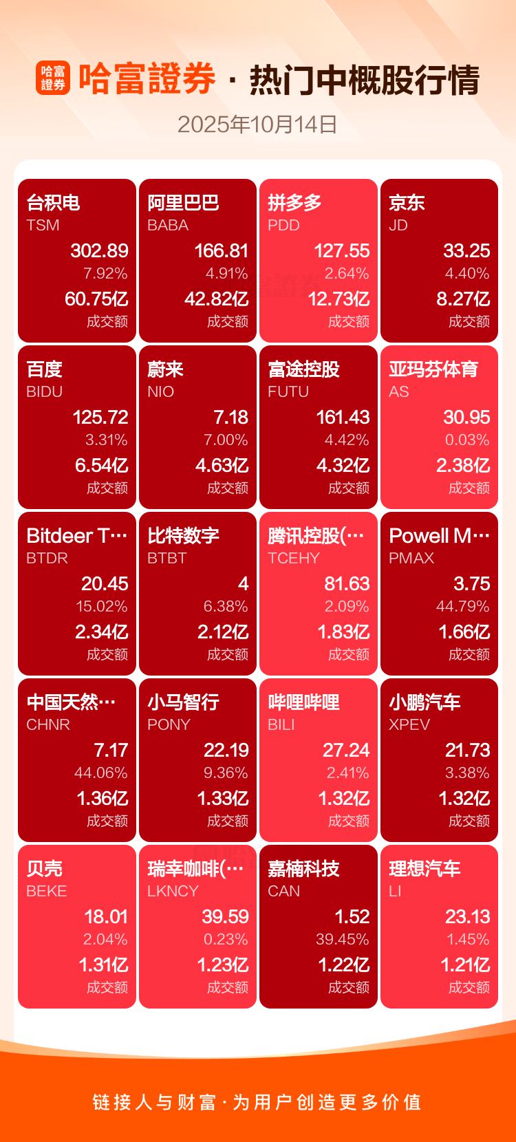 台积电涨7.92%,阿里巴巴涨4.91%,拼多多涨2.64%,京东涨4.40%,百度涨3.31%,蔚来涨7.00%,富途控股涨4.42%,亚玛芬体育涨0.03%,Bitdeer Technologies Group-A涨15.02%,比特数字涨6.38%。