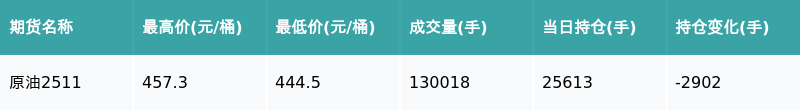 南财智讯10月13日电,南财金融终端盘后期货数据显示,上期能源的原油主力合约收跌2.68%,收盘报453.7元/桶,日内资金流出3.41亿元。其他相关指标见下表: