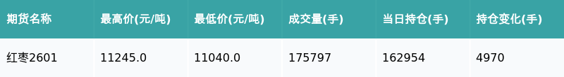 南财智讯10月13日电,南财金融终端盘后期货数据显示,郑州商品交易所的红枣主力合约收涨0.18%,收盘报11130.0元/吨,日内资金流入4765.17万元。其他相关指标见下表: