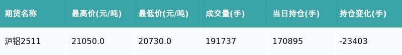 南财智讯10月13日电,南财金融终端盘后期货数据显示,上海期货交易所的沪铝主力合约收跌0.97%,收盘报20885.0元/吨,日内资金流出5.07亿元。其他相关指标见下表: