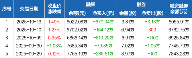 融资方面,当日融资买入490.17万元,融资偿还1170.11万元,融资净偿还679.94万元,连续7日净偿还累计3035.05万元。融券方面,融券卖出6700股,融券偿还3.8万股,融券余量3.81万股,融券余额33.83万元。融资融券余额合计6055.91万元。