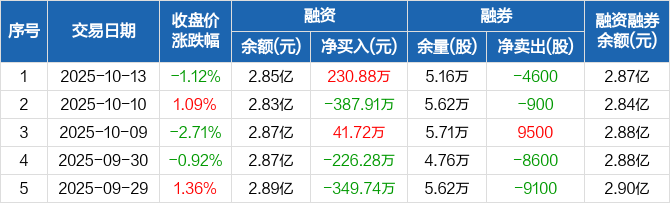 融资方面,当日融资买入651.85万元,融资偿还420.97万元,融资净买入230.88万元。融券方面,融券卖出0股,融券偿还4600股,融券余量5.16万股,融券余额118.68万元。融资融券余额合计2.87亿元。