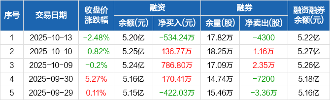 融资方面,当日融资买入2697.6万元,融资偿还3231.84万元,融资净偿还534.24万元。融券方面,融券卖出3000股,融券偿还7300股,融券余量17.82万股,融券余额168.4万元。融资融券余额合计5.22亿元。