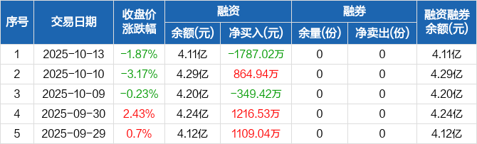 融资方面,当日融资买入3940.82万元,融资偿还5727.84万元,融资净偿还1787.02万元。融券方面,融券卖出0份,融券偿还0份,融券余量0份,融券余额0元。融资融券余额合计4.11亿元。