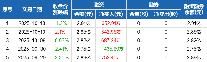 融资方面,当日融资买入2094.17万元,融资偿还1441.26万元,融资净买入652.91万元,连续3日净买入累计1683.12万元。融券方面,融券卖出0股,融券偿还0股,融券余量0股,融券余额0元。融资融券余额合计2.91亿元。