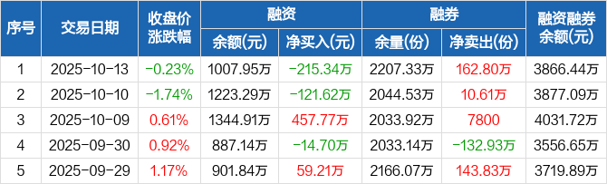 融资方面,当日融资买入373.64万元,融资偿还588.98万元,融资净偿还215.34万元。融券方面,融券卖出290.62万份,融券偿还127.82万份,融券余量2207.33万份,融券余额2858.49万元。融资融券余额合计3866.44万元。