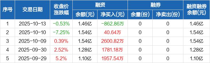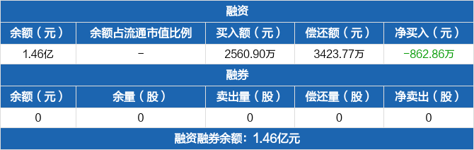 融资方面,当日融资买入2560.9万元,融资偿还3423.77万元,融资净偿还862.86万元。融券方面,融券卖出0份,融券偿还0份,融券余量0份,融券余额0元。融资融券余额合计1.46亿元。