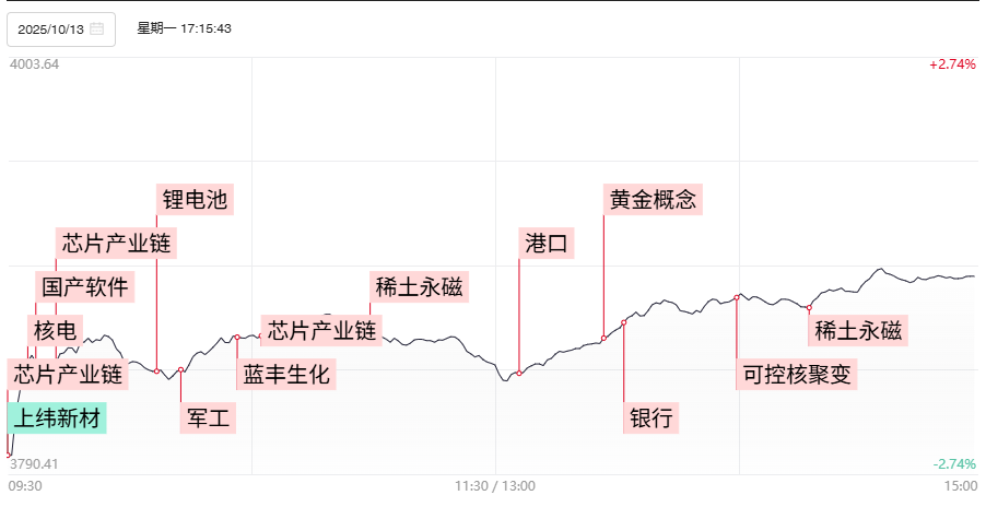 财联社10月14日电,上个交易日市场全天震荡回升,三大指数低开高走,科创50指数低开近3%,午后翻红大涨逾1%。沪深两市成交额2.35万亿,较上周五缩量1609亿。1)包钢股份和北方稀土将2025年第四季度稀土精矿关联交易价格环比上调37%至26205元/吨,稀土永磁概念全天高开高走,中国稀土、北方稀土、包钢股份等十余股涨停,金力永磁、银河磁体、龙磁科技创历史新高。2)10月15日到10月17日,“湾芯展”将在深圳会展中心(福田)举行,深圳市相关官员公开确认,本土半导体企业新凯来将参展,并会“给大家带来惊喜”,新凯来概念为首的半导体设备股继续强者恒强,至纯科技全天封死一字涨停,新莱应材、凯美特气实现连板晋级。此外多家券商将中芯国际、佰维存储两融折算率分别再调回70%、50%,使得新凯来概念热度向整个半导体产业链扩散,科创芯片人气股华虹公司时隔1年多再度收获20厘米涨停,中芯国际大涨6%并反包上周五阴线。3)本周国际原子能机构聚变能大会将在成都举办,可控核聚变概念热度居高不下,人气股合锻智能晋级4连板,安泰科技开盘一字涨停晋级3连板,此外哈焊华通、联创光电、永鼎股份等多股创出历史新高。4)10月9日,商务部发布2025年第61号公告,除管制规则外,公告附件采用.wps格式,申请文件须以中文提交两大细节引发热议。早盘国产软件板块一度大幅冲高,中国软件、榕基软件涨停,金山办公、诚迈科技、麒麟信安等多股一度涨超10%。