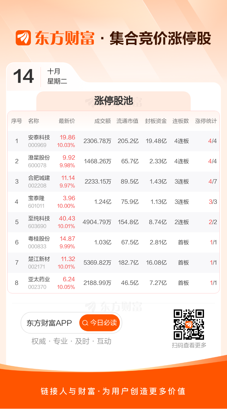 10月14日集合竞价:安泰科技、澄星股份4连板