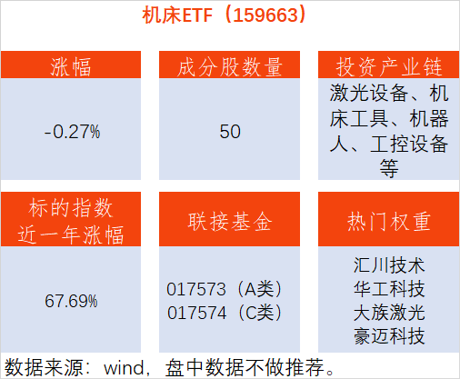 机床ETF(159663),紧密跟踪的中证机床指数,涵盖了我国制造业产业链中的关键一环——高端装备制造领域,涉及激光设备、机床工具、机器人、工控设备等行业,是新质生产力理念强调创新驱动与产业升级落地实践的核心阵地。