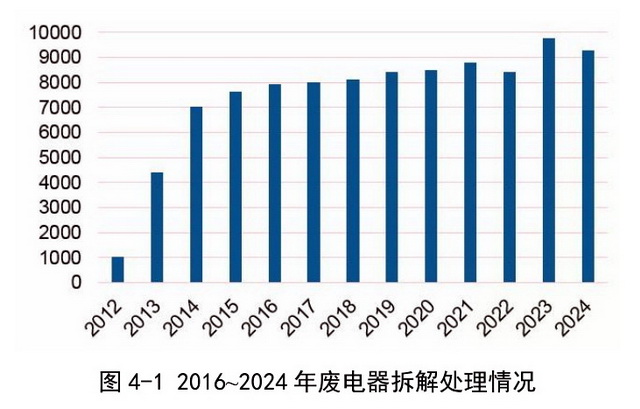2016~2024 年废电器拆解处理情况。资料来源:生态环境部