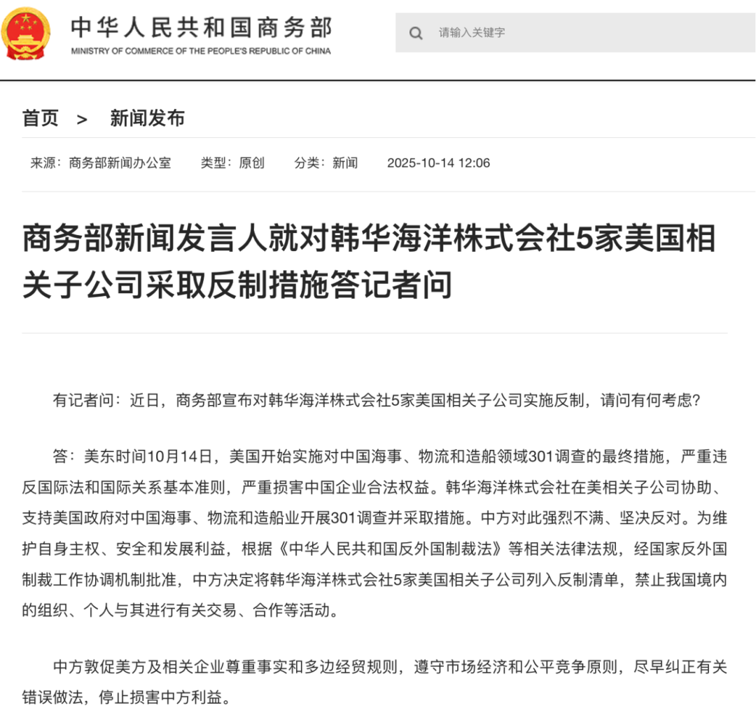 对此,商务部新闻发言人表示,美东时间10月14日,美国开始实施对中国海事、物流和造船领域301调查的最终措施,严重违反国际法和国际关系基本准则,严重损害中国企业合法权益。韩华海洋株式会社在美相关子公司协助、支持美国政府对中国海事、物流和造船业开展301调查并采取措施。中方对此强烈不满、坚决反对。为维护自身主权、安全和发展利益,根据《中华人民共和国反外国制裁法》等相关法律法规,经国家反外国制裁工作协调机制批准,中方决定将韩华海洋株式会社5家美国相关子公司列入反制清单,禁止我国境内的组织、个人与其进行有关交易、合作等活动。