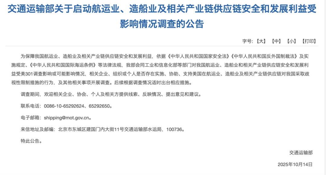 同日,交通运输部发布公告称,为保障我国航运业、造船业及相关产业链供应链安全和发展利益,依据《中华人民共和国国家安全法》《中华人民共和国反外国制裁法》及实施规定、《中华人民共和国国际海运条例》等法律法规,我部会同工业和信息化部等部门对我国航运业、造船业和相关产业链供应链安全和发展利益受美301调查影响或可能影响情况,相关企业、组织或个人是否存在实施、协助、支持美国在航运业、造船业及相关产业链供应链对我国采取歧视性限制措施的行为,及其他相关事项开展调查。后续根据调查情况适时出台相应措施。