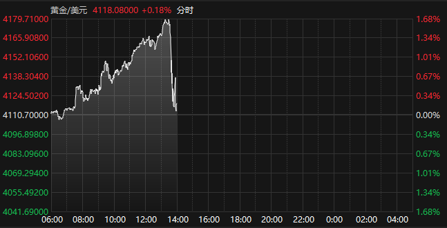 上证报中国证券网讯据Choice数据,10月14日,国际现货黄金冲高回落,截至14:00报4118.08美元/盎司,短线下挫超1%。