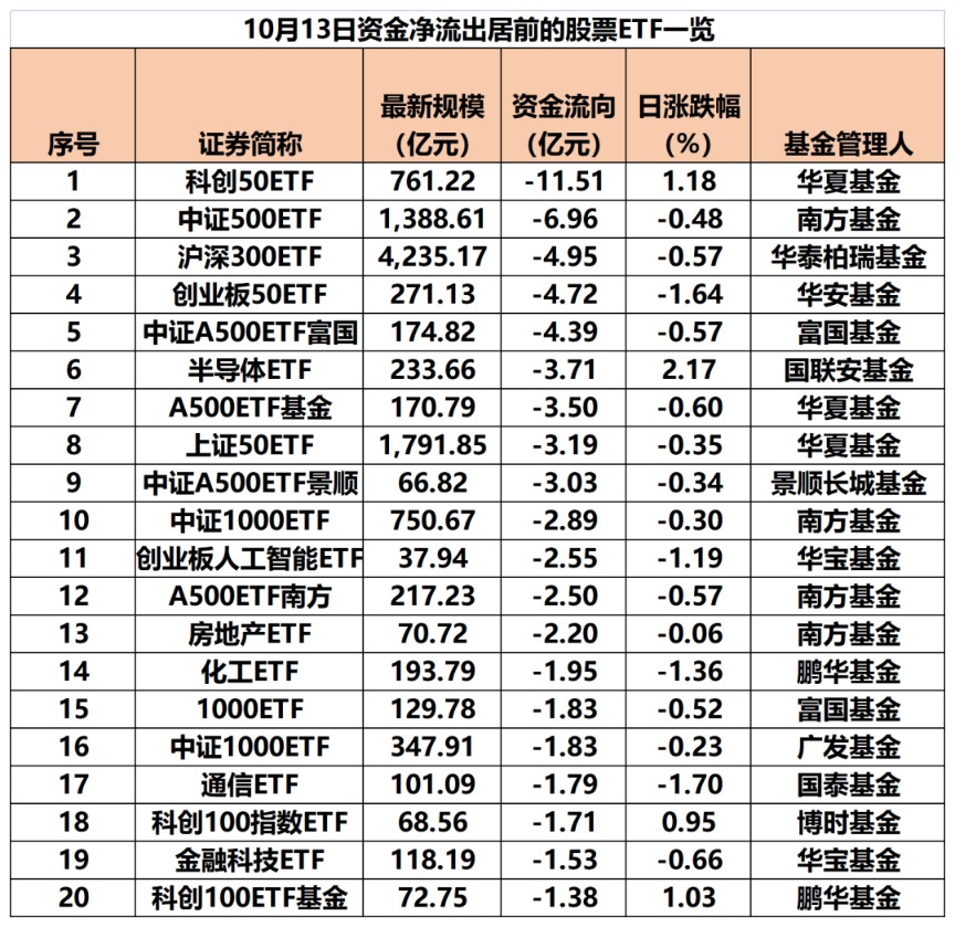 从单日资金净流出排行看,科创50ETF、中证500ETF、沪深300ETF、创业板50ETF等宽基ETF产品成为“失血”大户。半导体、房地产、通信等热门主题ETF产品的资金净流出居前。