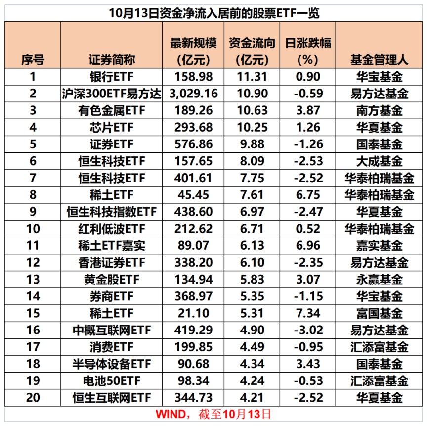 10月13日,易方达基金旗下沪深300ETF资金净流入10.9亿元,最新规模约为3030亿元;香港证券ETF净流入6.1亿元,该产品是全市场唯一跟踪香港证券指数的ETF产品,支持T+0交易,且管理费率仅为0.15%/年。此外,易方达基金旗下中概互联网ETF净流入近5亿元;稀土ETF净流入3.7亿元;科创板50ETF净流入1.1亿元,最新规模达768亿元,位居同类产品第一。