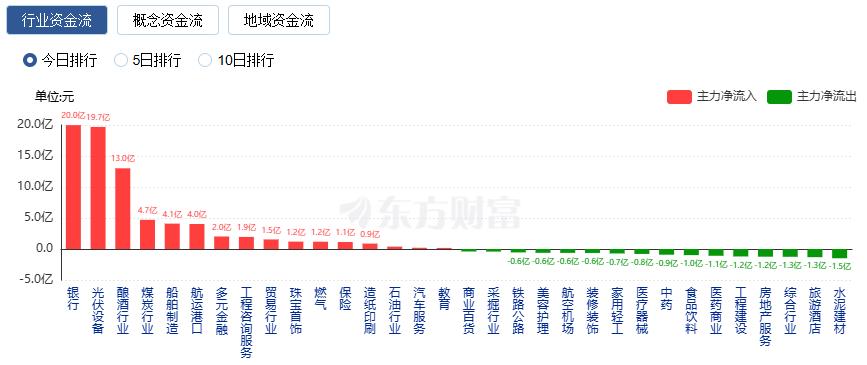 行业资金方面,截至收盘,银行、光伏设备、酿酒行业等净流入排名靠前,其中银行净流入19.98亿。